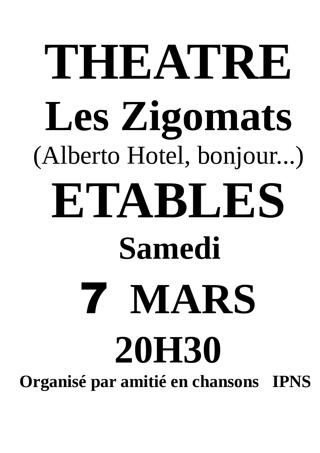 Théâtre les Zigomats + Ajouter à mon Agenda Google + iCal / Outlook export 00 jours 00 heures 00 minutes 00 secondes Recherche :